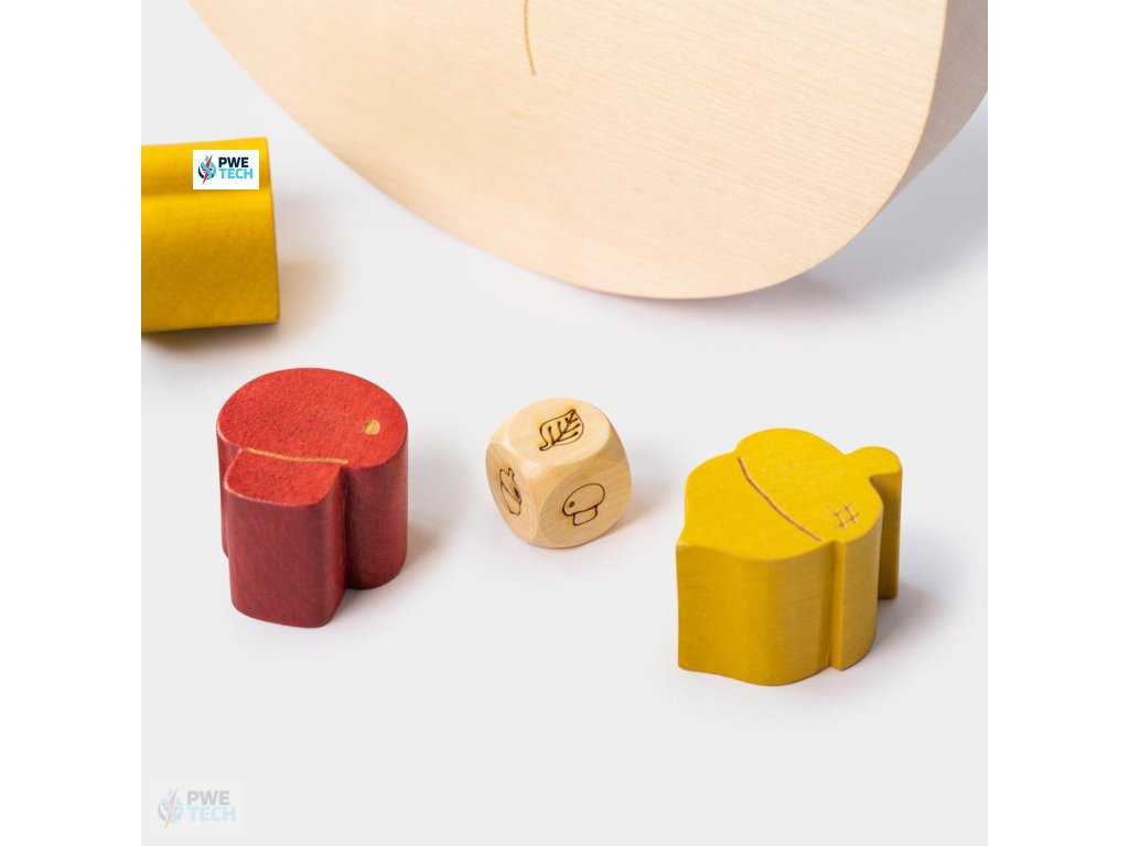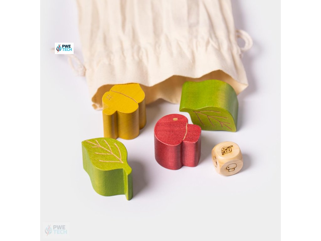 Súčasťou sady je aj kocka s obrázkami znázorňujúcimi všetky prvky (listy, hríby a žalude), ktorých hod určuje poradie ukladania.