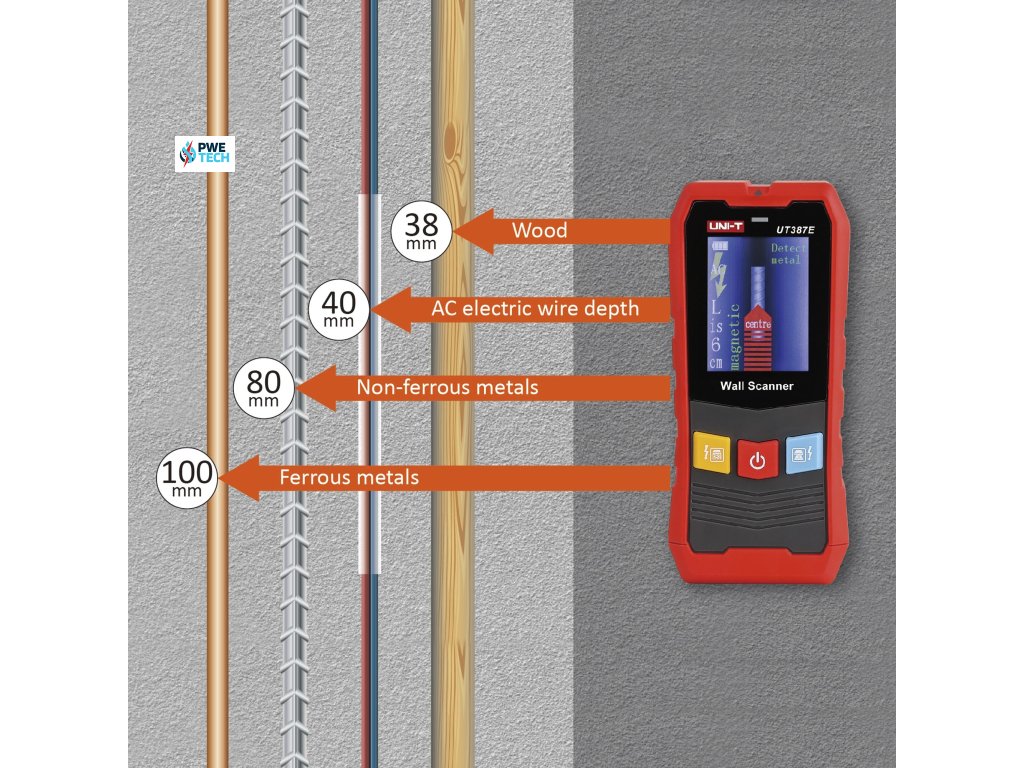 UT387E ponúka všestrannosť pri detekcii rôznych materiálov. Schopnosť detekovať kov v stenách do hĺbky 100 mm a vodiče pod napätím AC 110~220 V do hĺbky 50 mm poskytuje širokú škálu aplikácií. Okrem toho zariadenie efektívne lokalizuje drevené stĺpiky v stenách a ponúka dva režimy detekcie: presný (do 20 mm) a hĺbkový (do 38 mm). K dispozícii je aj detekcia neželezných kovov a medi (> 4 mm²), čo zvyšuje funkčnosť a presnosť.