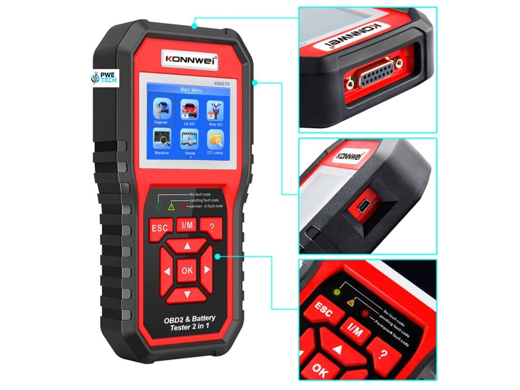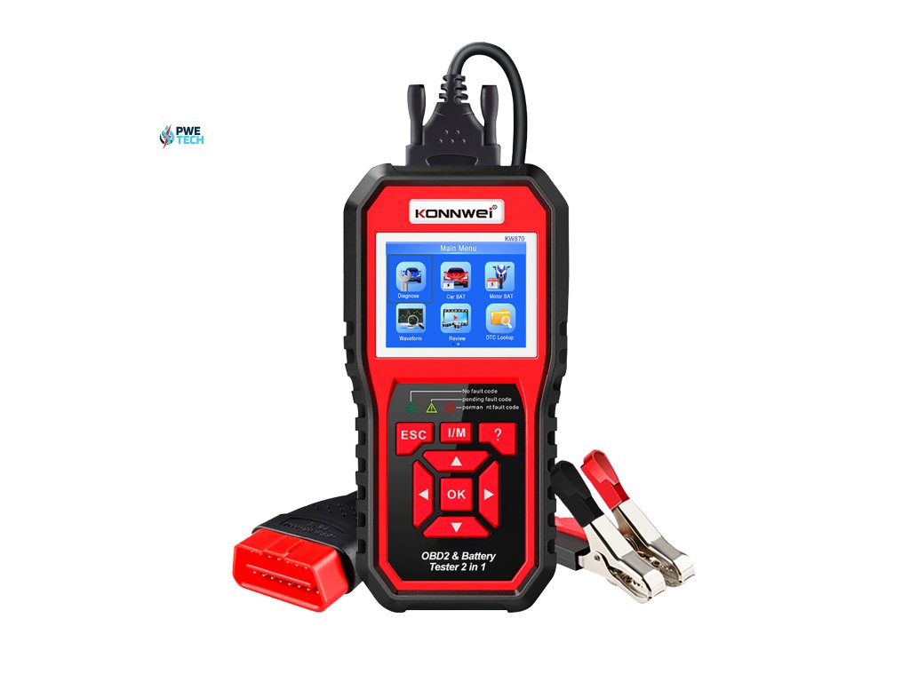 Tester autobatérií Konnwei KW870 dokáže efektívne analyzovať a čítať dôležité údaje o vozidle, ako je napätie, vnútorný odpor, štartovací prúd za studena a kapacita v Ah. Taktiež vypočítava štartovaciu kapacitu za studena a starnutie, čo umožňuje rýchlejšie a presnejšie opravy auta.