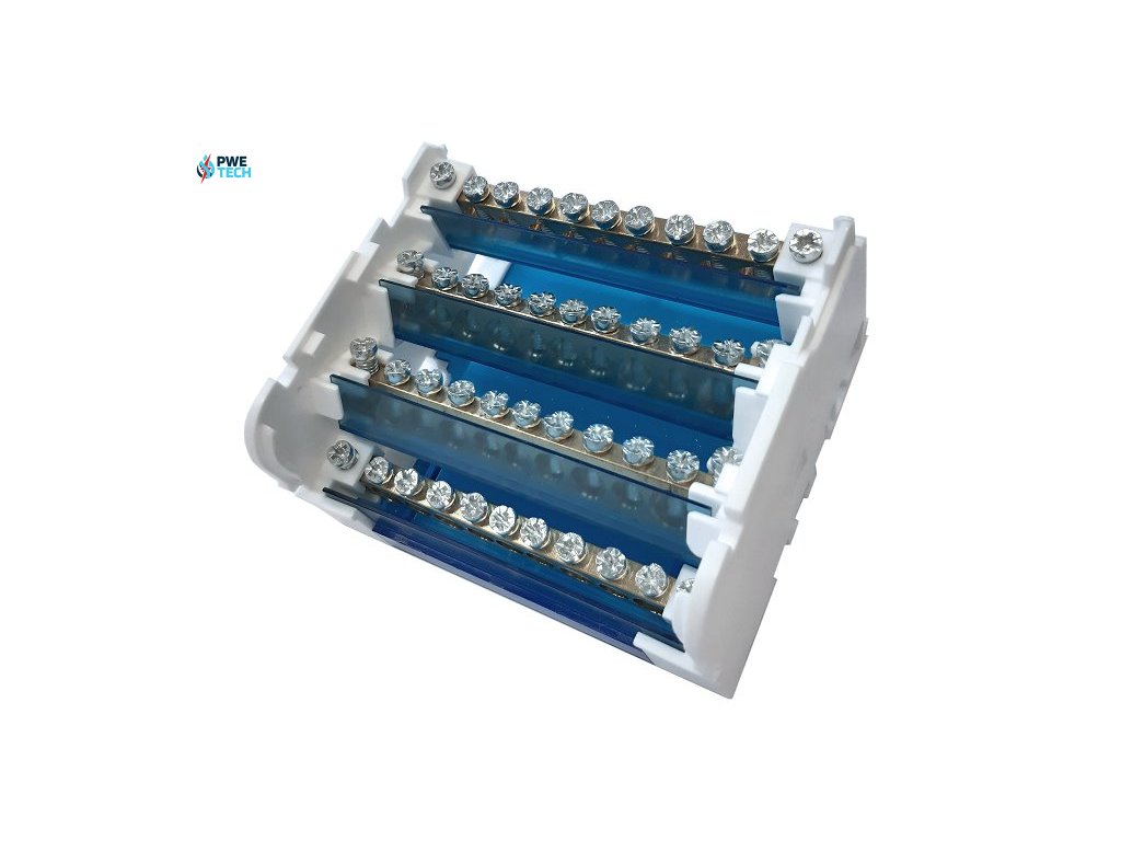 Distribučný alebo tiež rozvodný blok s mosadznými skrutkami na správne a prehľadné pripojenie káblov v nízkonapäťových rozvodniach.