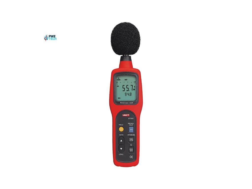 UT352 je vybavený 1/2" kondenzátorovým mikrofónom, ktorý zaisťuje vysokú presnosť merania. Má výstupy AC (približne 0,707 V pri impedancii 600 Ω) a DC (približne 10 mV/dB pri impedancii 100 Ω), ktoré umožňujú pripojenie k externým systémom na záznam alebo analýzu údajov. UT352 je napájaný štyrmi 1,5 V (LR6) batériami, takže je prenosný a ľahko sa používa, zatiaľ čo indikátor slabej batérie a funkcia automatického vypnutia zvyšujú jeho účinnosť.