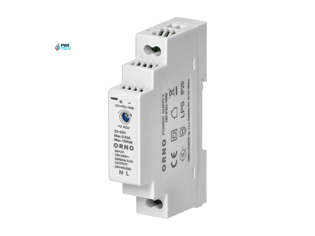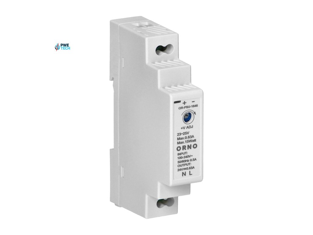 Vysoko účinný a spoľahlivý napájací adaptér na DIN lištu s maximálnym zaťažením 15 W a nastaviteľným výstupným napätím 24 V DC. Bol vyvinutý pre inštaláciu na DIN lištu a možno ho použiť v širokom spektre aplikácií, napr. v priemyselných aplikáciách, nízkonapäťových inštaláciách, ako sú CCTV alebo poplašné systémy. Tento napájací adaptér obsahuje: ochranu proti preťaženiu, prepäťovú ochranu a ochranu proti prepätiu. Integrovaná dióda indikuje aktiváciu zariadenia.