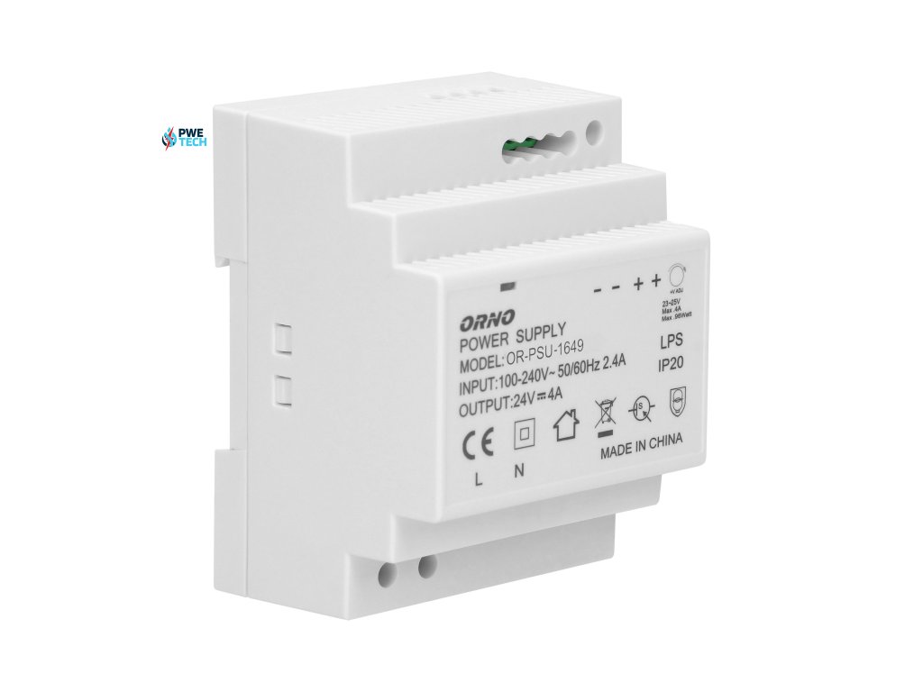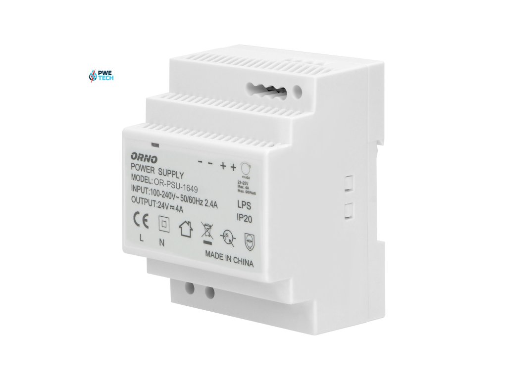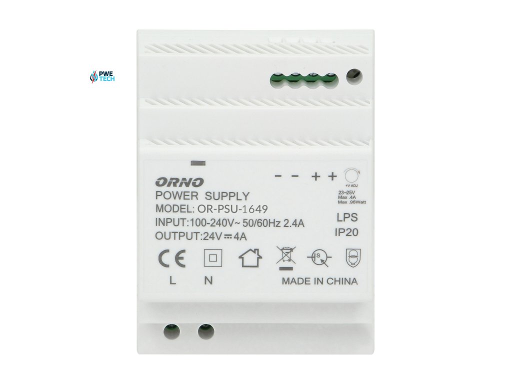 Vysoko účinný a spoľahlivý napájací adaptér na DIN lištu s maximálnym zaťažením 100 W a nastaviteľným výstupným napätím 24 V DC. Bol vyvinutý pre inštaláciu na DIN lištu a možno ho použiť v širokom spektre aplikácií, napr. v priemyselných aplikáciách, nízkonapäťových inštaláciách, ako sú CCTV alebo poplašné systémy. Tento napájací adaptér obsahuje: ochranu proti preťaženiu, prepäťovú ochranu a ochranu proti prepätiu. Integrovaná dióda indikuje aktiváciu zariadenia.
