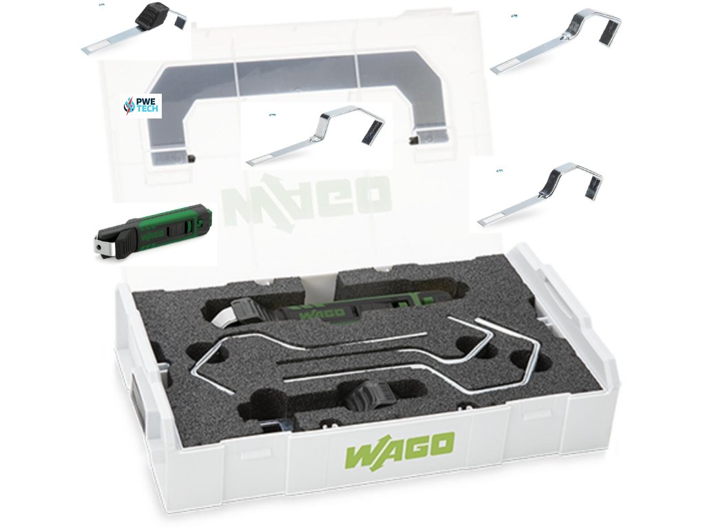 Obsah sady : Balenie obsahuje samotný nástroj Odizolovací nôž WAGO 206-1403 pre Ø 8–28 mm s inteligentným systémom výmeny držiakov - pwetech.store a všetky potrebné držiaky káblov pre inteligentný systém výmeny, uložené v praktickom boxe L-BOXX® Mini.