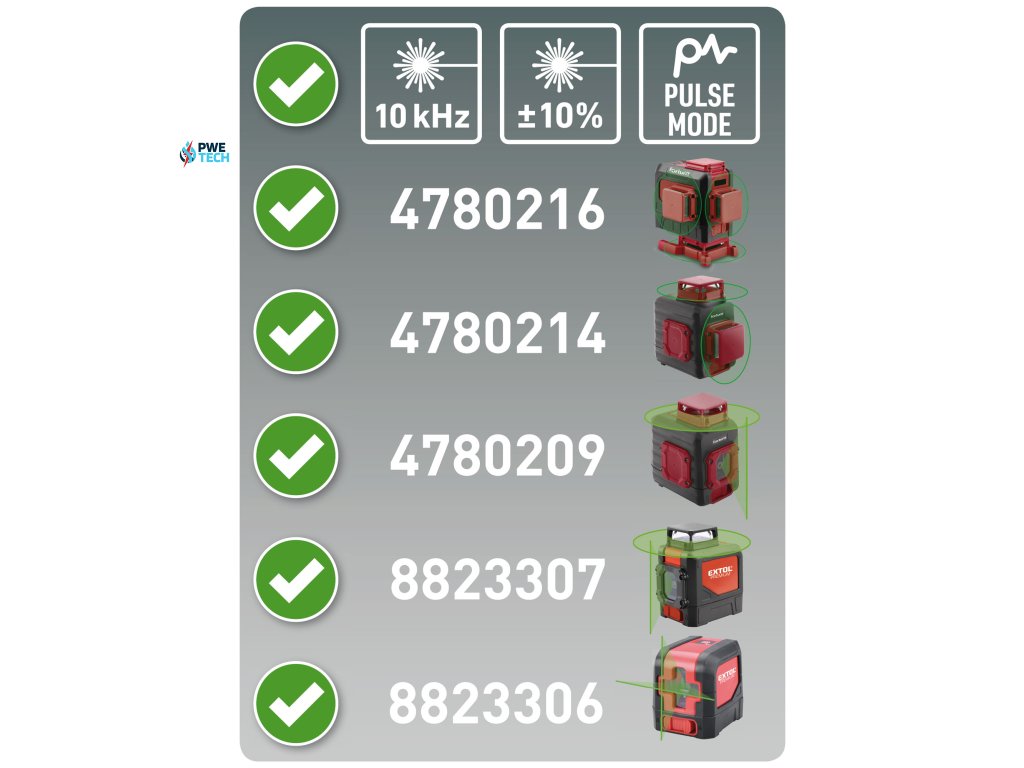 - prijímač deteguje červený aj zelený laserový lúč s frekvenčnou charakteristikou 10kHz (± max.10%), za podmienky, že je lúč vysielaný laserovými prístrojmi v tzv. pulznom móde, laserový prístroj musí byť vybavený touto funkciou