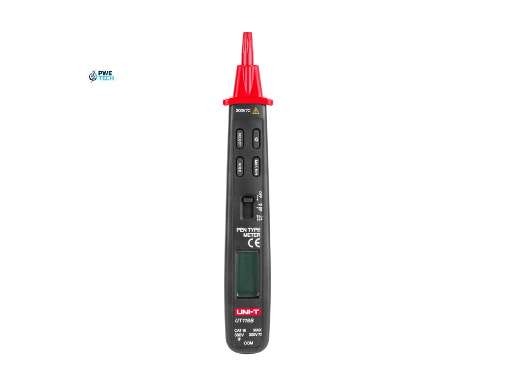 Model UT118B sa vyznačuje mimoriadne kompaktným a ľahkým dizajnom, vďaka čomu sa ľahko prenáša a je ideálny na prácu v stiesnených priestoroch. S rozmermi 20 x 27 x 182 mm a hmotnosťou iba 90 g zaručuje zariadenie pohodlné používanie. Podsvietený LCD displej s rozmermi 28 x 14 mm zaisťuje ľahké čítanie aj pri slabom osvetlení.
