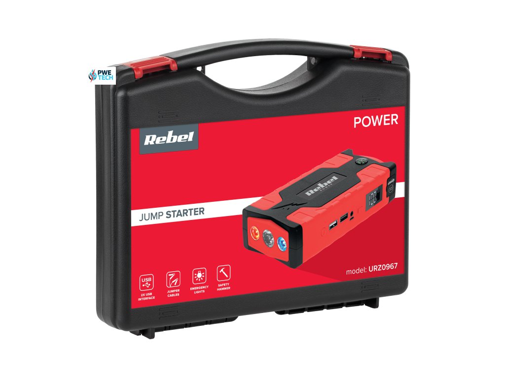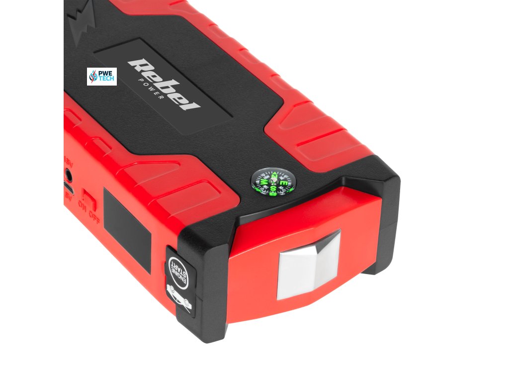 Jump Starter Rebel je powerbanka s funkciou štartovania do auta. Zariadenie je vybavené batériou s kapacitou 10 000 mAh. Sada obsahuje kábel 3 v 1 (micro USB, USB-C, Lightning) napríklad na nabíjanie smartfónov. Súčasťou balenia sú aj štartovacie svorky na štartovanie slabej batérie auta, motorového člna alebo štvorkolky. Táto prenosná batéria sa dodáva aj s nabíjačkou do auta a do siete, čo ďalej rozširuje možnosti zariadenia a môže byť veľmi užitočné v prípade poruchy.