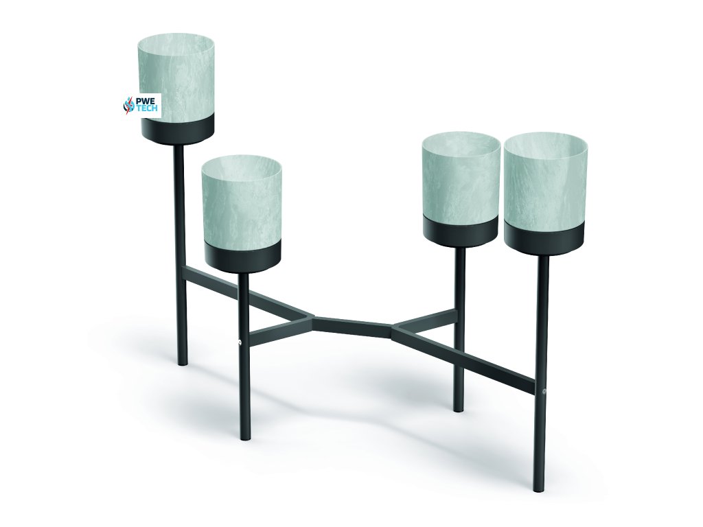 Široký stojan na rastliny Bloomie Stand. Je vyrobený z kovového rámu s pripevnenými podšálkami, ktoré podopierajú kvetináče vo výškach 43 a 58 cm.