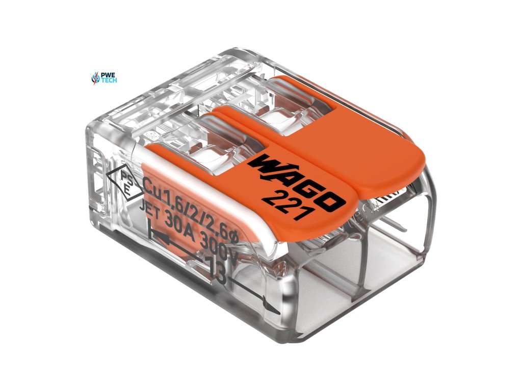 WAGO 221-612 Spojovacia svorka COMPACT (2-vodičová, do 6 mm²). Kompaktná páčková svorka WAGO 221-612 predstavuje moderný štandard v elektroinštalácii. Je určená na rýchle, bezpečné a beznástrojové spojenie dvoch vodičov všetkých typov (pevné, lankové aj jemne lankové) až do prierezu 6 mm².