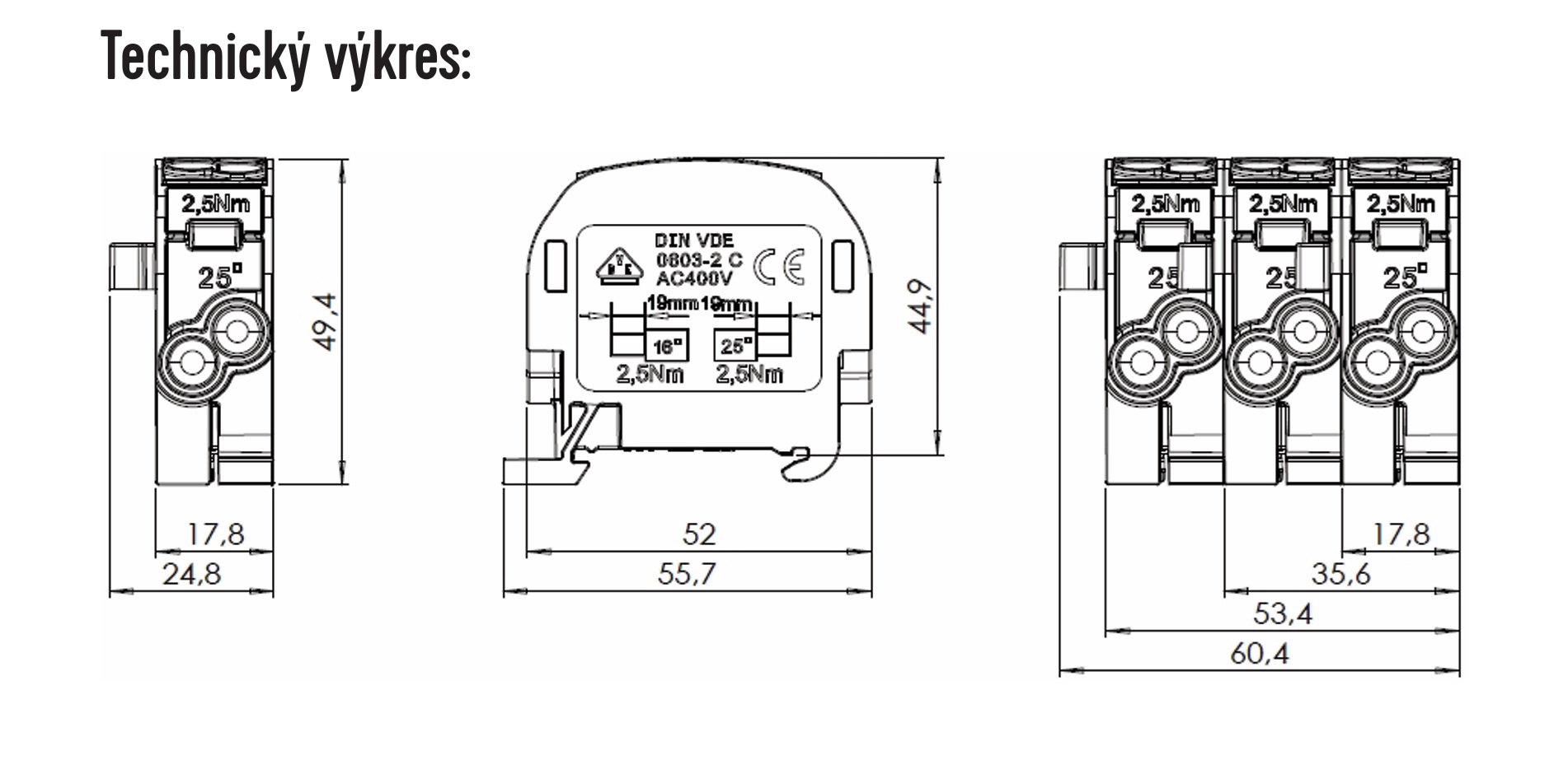 Svorkovnica rozbočovacia Cu HLAK 25/1 C L šedá 152A vstup 2x25mm2 výstup 2x16mm2