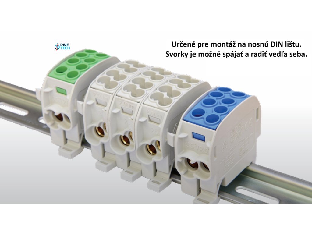 Kryté rozbočovacie svorky HLAK35/1 určené pre montáž na DIN lištu umožňujú pripojenie vstupných medených vodičov prierezov od 4 do 35 mm² a výstupných medených vodičov prierezov od 2,5 do 25 mm². Svorky je možné spájať a radiť vedľa seba.