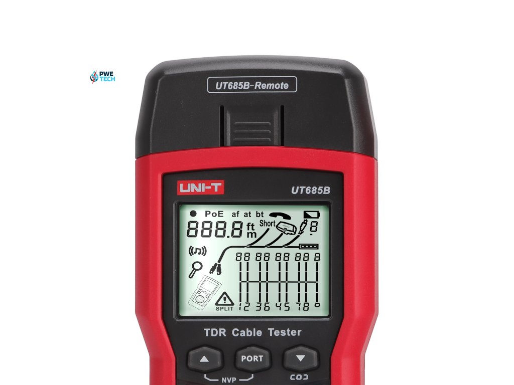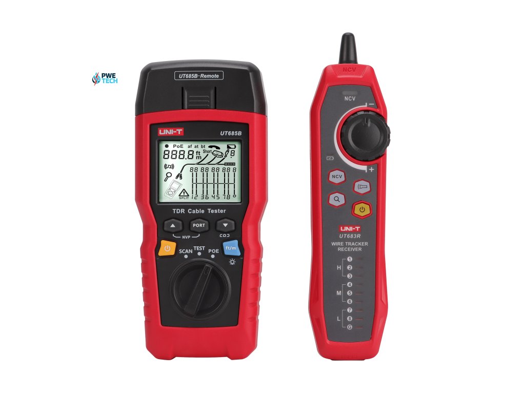 Tester kábla UT683B KIT je ručný tester káblov TDR, vhodné pre medené káble (CAT 5E, CAT 6, CAT 6A alebo CAT 8), ktorý sa používa na detekciu a diagnostiku stavu zapojenia krútených párov a koaxiálnych káblov, detekciu sieťových služieb, skratov/otvorených obvodov v sieťovej kabeláži, rozdelenie páru, chybného zapojenia atď. Možno ho tiež použiť na zistenie, či je v sieťovej kabeláži prívod PoE (modul POE), a štandardu PoE (802.3AF, 802.3AT, 802.3BT). Na obrazovke je možné súčasne zobraziť mapu vodičov, dĺžku kábla, miesto prerušeného obvodu a ďalšie informácie. Tester káblov sa vyznačuje presnosťou, jednoduchou obsluhou, viditeľným zobrazením, čo z neho robí ideálny nástroj pre údržbu sieťovej komunikácie.