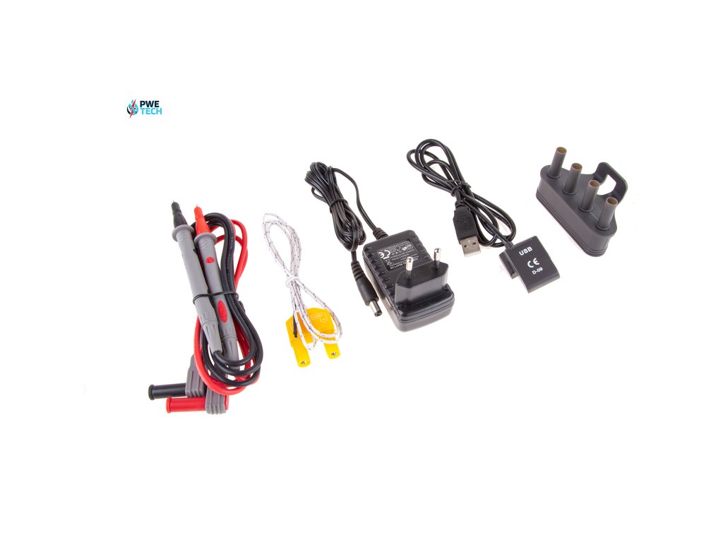 Príslušenstvo: meracie káble, sonda na meranie teploty, USB kábel, nabíjačka, nabíjacia zásuvka, puzdro