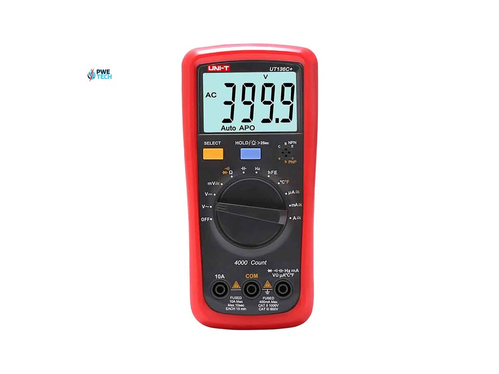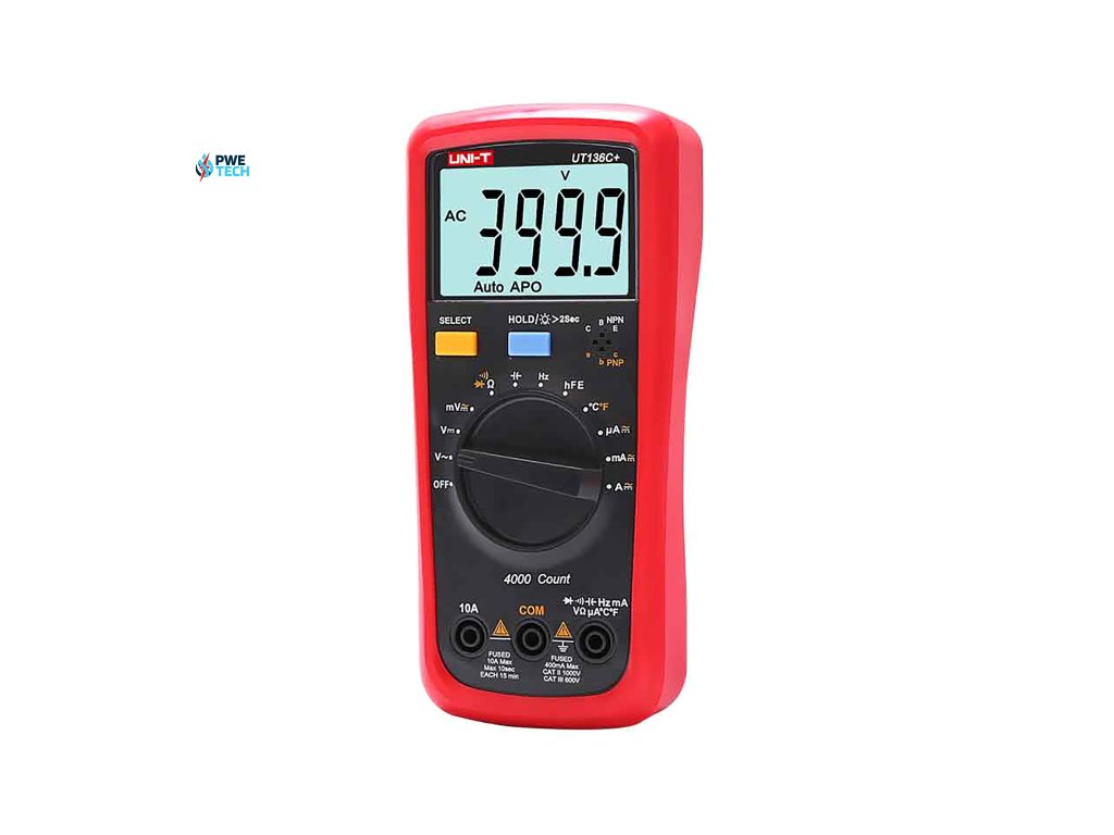 UT136C+ meria jednosmerné (DC) a striedavé (AC) napätie až do 1000 V, čo mu umožňuje pracovať s rôznymi typmi elektrických inštalácií. Meria tiež prúd do 10 A a odpor do 40 MOhm, vďaka čomu je všestranným diagnostickým nástrojom. Okrem toho merač ponúka široký rozsah merania teploty od -40 °C do 1000 °C a od -40 °F do 1832 °F, čo ďalej rozširuje jeho funkčnosť. Jeho rozsiahle možnosti dopĺňa testovanie diód, testovanie kontinuity a meranie hFE tranzistorov.